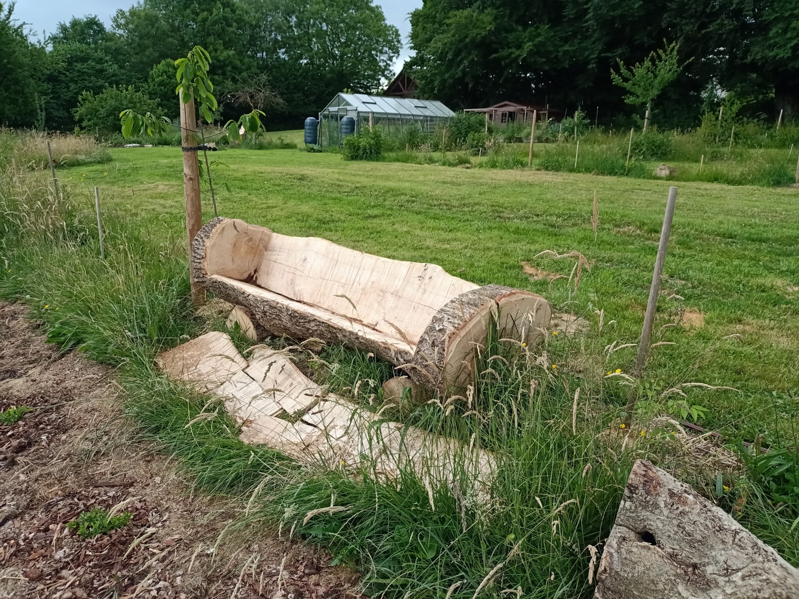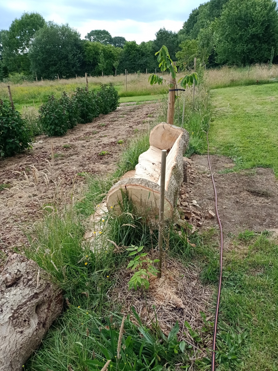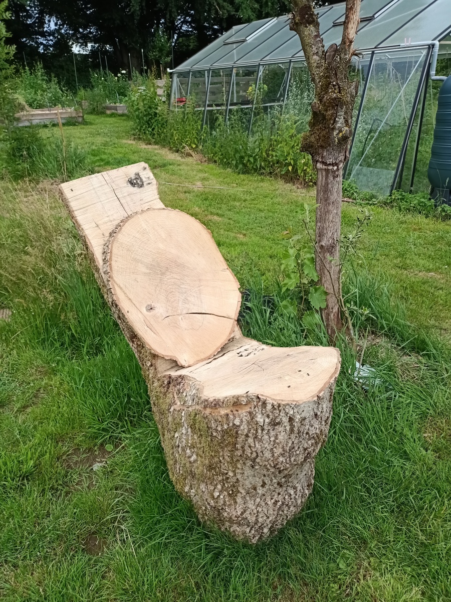 Avec l’aide de Barnabé, nous avons réutilisé le frêne qui risquait de tomber sur la maison pour en faire des endroits proches de la nature, favorisant l’intégration et l’interaction douce avec le jardin forêt.